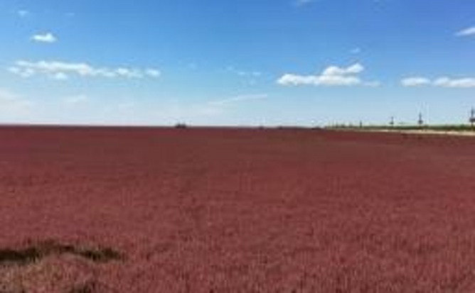 盘锦红海滩和在稻田里用植物织成的凤凰