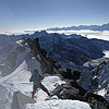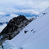 雪坡接近山脊时接近60度,翻上山脊后便可一路直上,经过大段的坡度40度左右的雪坡就可以看到主峰的石头顶峰。接近顶峰的雪脊非常陡峭,在这里可以观察到西面是极端陡峭的绝壁和南方遥远的四姑娘峰的主峰,以及东面BC边的大海子。