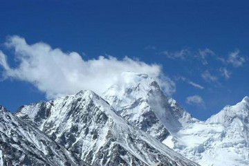 普莫里峰位于珠峰西侧,在西藏和尼泊尔边境上,海拔7161米,积雪丰厚,峰状圆润可爱,不管从哪个方位望去, 都像一支插向天际的雪白竹笋。山峰附近都是冰河, 下游是世界最高海拔的绒布寺。