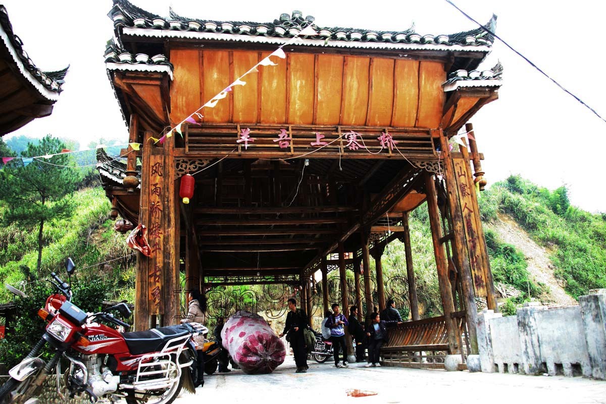 早上我們離開西江千戶苗寨,目標雷山縣丹江鎮陶堯村,將近中午時刻,路過雷山縣西江鎮羊吾村,看到河灘地上彩旗飄揚,停車一問,說十二點有斗牛活動。我們找了一個停車位,就地準備看斗牛比賽。