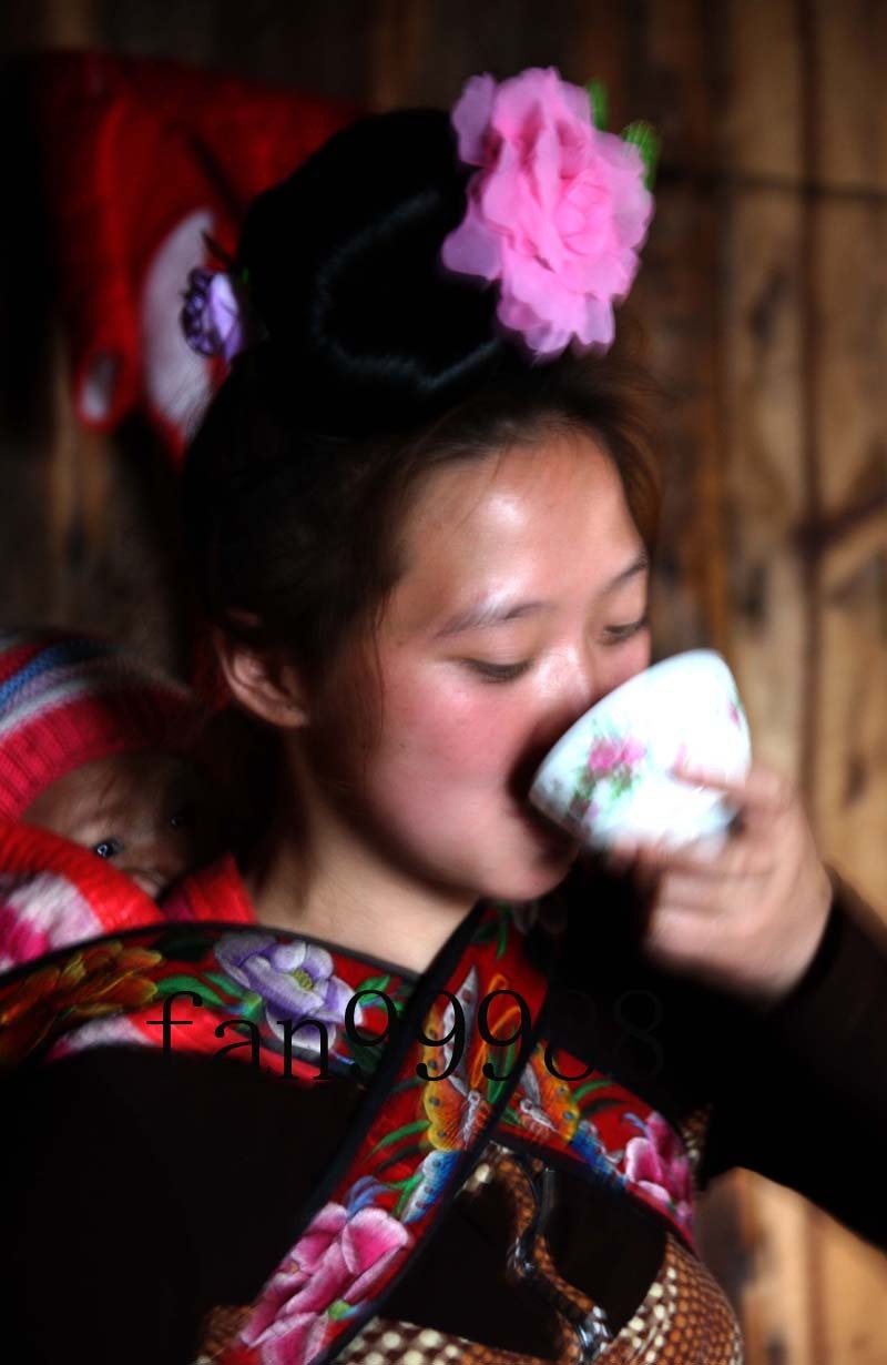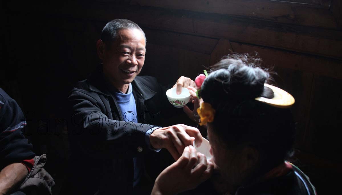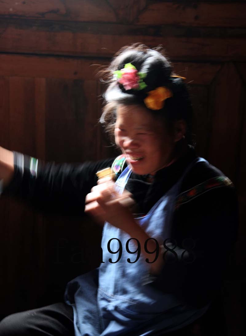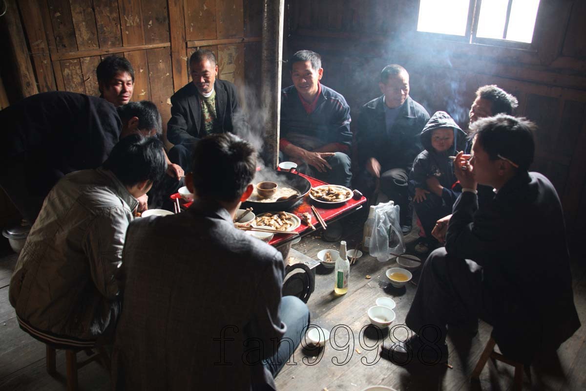 從西江千戶苗寨出來,一路也沒有見到飯店,三人早餐都沒有吃,羊吾村也沒有見到飯店。我們在路旁隨便問了一家有否飯店的,主人就熱情地將我們請了進去,告訴我們這村沒有飯店,讓我們參加她們鼓藏節,一起喝酒。這裡一家來了親戚正在喝酒,圍坐在火爐喝酒吃肉。
