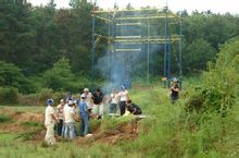 因地制宜,可设计成锥形、星形、“并”宁形、并排形、屋顶形、牧场形等等。也可利用石块支起干柴或在宕石壁下面,把干柴斜靠在岩壁上,在下面放置引火物后点燃即可。一般情况下,在避风处挖一个直径1米左右,深约30厘米的坑。如果地面坚硬无法挖坑也可找些石块垒成一个圆圈,圆圈的大小根据火堆的大小而定。然后将引火物放在圆圈中间,上面架些干柴后,点燃引火物引燃干柴即成篝火。如果引火物将要燃尽时干柴还未燃起,则应从干柴的缝隙中继续添入引火物,直到把干柴燃烧起来为止,而不要重新架柴点火。