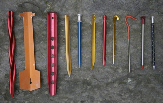 帐篷地钉:MSR Cyclone(飓风,35g),Toughstake(33g),MSR Snowstake(雪地地钉,22g),DAC Y(14g),Easton Nano Nail(9g),DAC V(11g),MSR Mini Groundhog(9g),Hilleberg Tri-peg(8g),Vargo 6.5 Titanium(钛钉,8g),MSR Carbon Core(碳素地钉,5.5g),Easton Full Metal Jacket(5.5g)