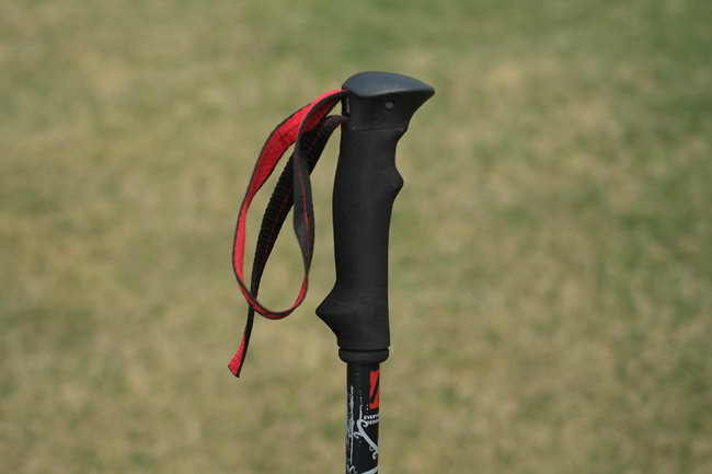 加宽的手柄头,比通常的手柄头大了许多,前部增加了一块凸出的部分。真正使用起来,才体会到这种设计的妙处,下山坡度比较大的时候,用手握住手柄头向下用力,竟然是意想不到的舒适,前部凸出的部分正好切合了手指回扣的掌握,提放自如。高弹力EVA手柄握感舒适,可调节腕带简单方便。