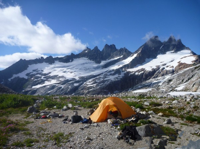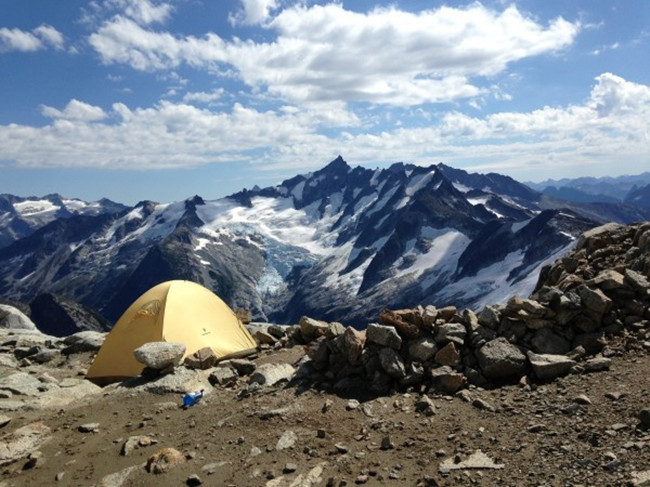在测试背包的旅途上,经过长长一天的跋涉,海拔上升5000英尺(1524米),我们找到了一处天赐营地,看到了南部雪山的美妙景色。