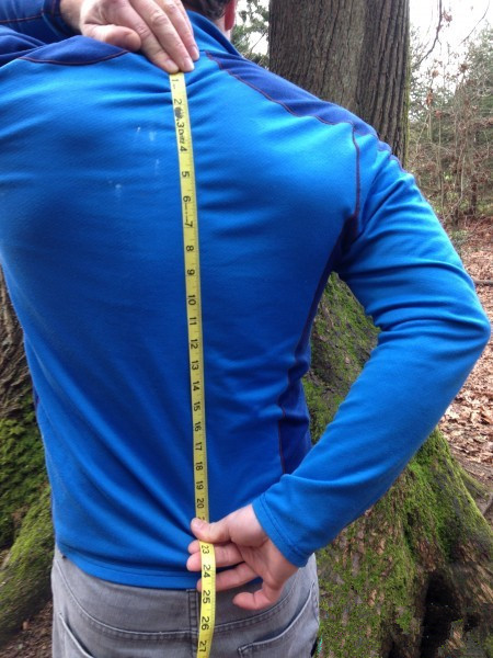 照片显示了正确的背部长度测量。从你脊柱第七节(向前低头,颈部脊柱突起最大的地方。注:大椎穴)向下量到骨盆带。