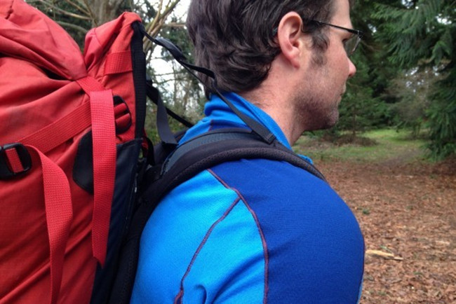 伊恩·尼克尔森展示正确的肩带和负重带的状态。注意,伊恩的肩膀和肩带之间有微不可查的间隙,负重调节带(最上面的调节带)的理想状态是成45度角,但30-60度角度都是没问题的。