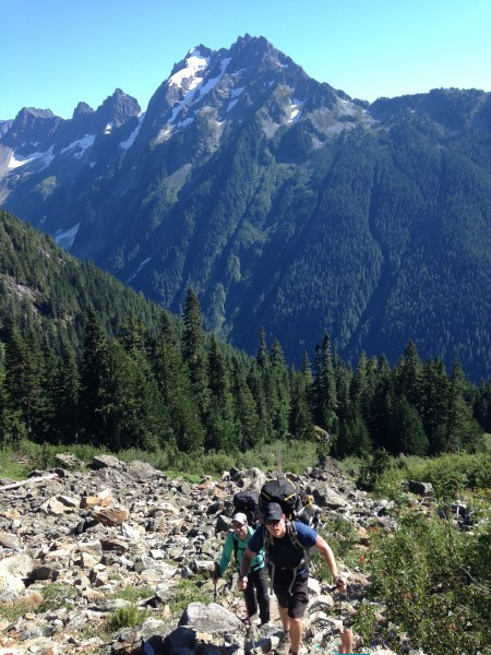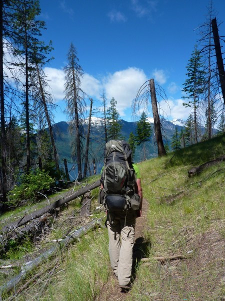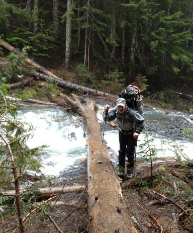 舒适性不仅是这个背包在平路上或者路况良好的旅途上的表现,更重要的是背着这个包在户外崎岖地形行走时的感受,例如丛林寻路穿越,穿越伐木小径,等等。照片显示的是测试员在华盛顿州北卡斯卡德山脉测试背包。