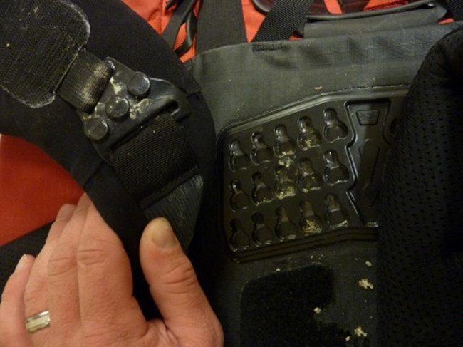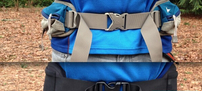 对比两个背包腰带上的插扣,下面这个是传统的插扣,上面这个用的重定向带,要容易使用。