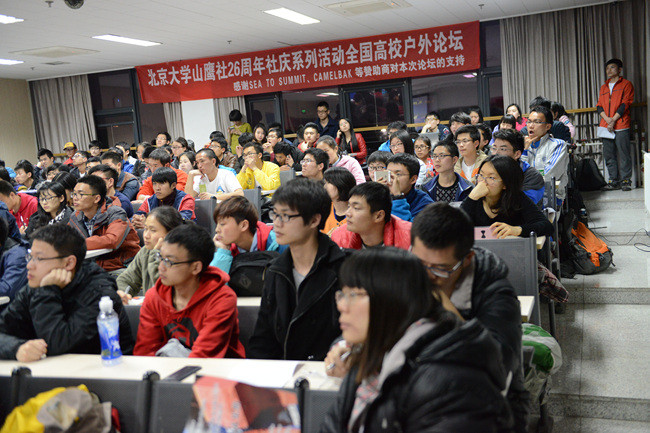 4月4日晚,北大山鹰社26周年社庆系列活动之“全国高校户外论坛”于北京大学理科教学楼举办,来自北京、天津、上海、安徽、新疆等十几个地区的24个高校户外社团参与了本次活动。出席论坛的嘉宾有中国登山协会高山医学专家、户外风险管理专家、原中国登山协会户外部主任李舒平,中国登山协会高山探险部主任罗申,中国登山协会教练方翔,深圳市登山户外运动协会副会长曹峻,巅峰户外运动学校校长、国内著名登山家孙斌。