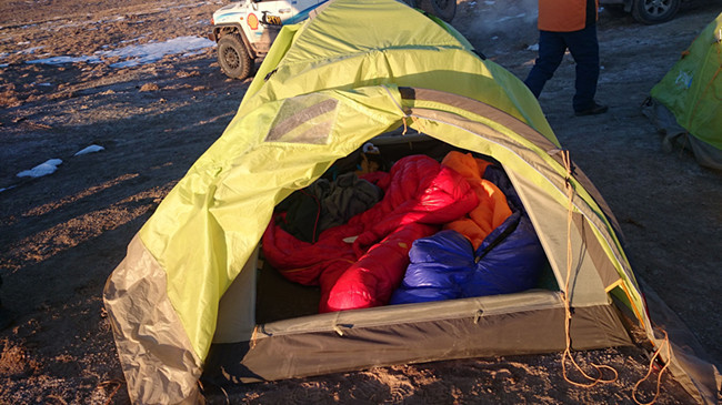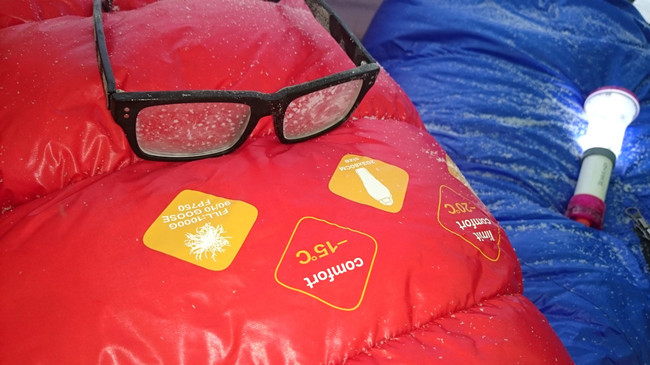 由于气温实在太低,每天帐篷内都会结霜。好在N5311111260面料具有高密度防泼水的特性,不然羽绒被打湿哪怕是有一点点潮,这么冷的夜晚都是非常可怕的事情。