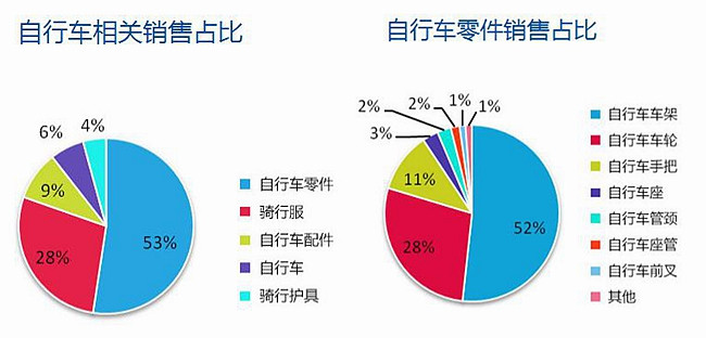 以上数据可以看出,目前自行车零件销售占自行车行业产品一半以上,其次为骑行服、自行车配件等。其中,销售额占比最大的是自行车零件产品,约为46%,如车架、车轮、车把等,其次是骑行服,占比为34%,而自行车配件的销售额占比为10%。
