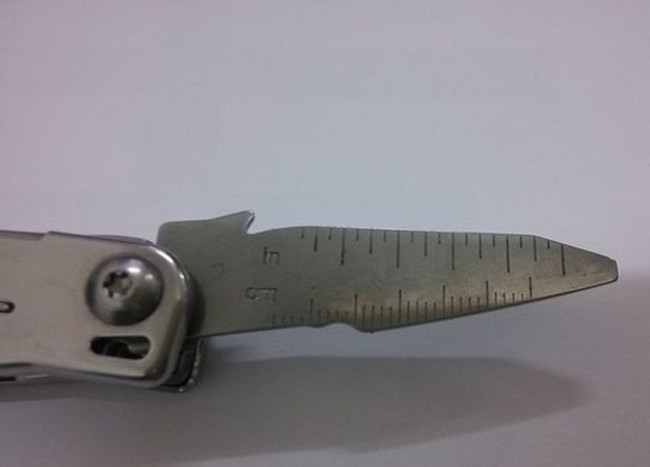 锉刀背面是个短小的尺子,上面英寸,下面厘米,看到下面这个倾斜的尺子刻度,有没有人想要吐槽一下直角边和斜边的关系?其实设计者已经考虑到了,是按照直线长度标的刻度。