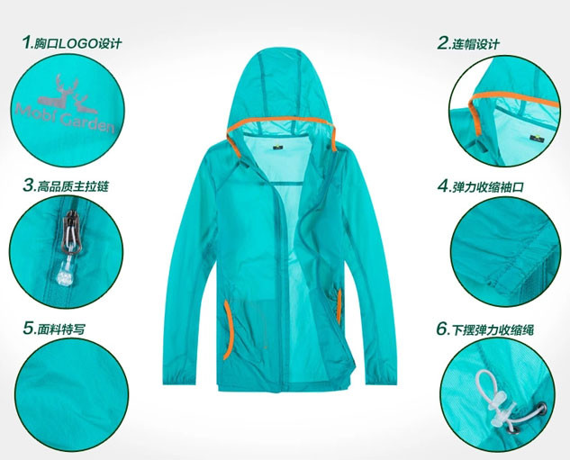 20D超细尼龙,棉感亲肤;全面料超强透气,拒绝闷热;防泼水处理。可折叠成手帕大小,便于携带。连帽设计更有效防护风雨及阳光,穿着舒适,轻柔肌肤。异色压线及包边提升单色皮肤衣的时尚感,多颜色可选。不仅防晒、防风、防水、防雨,而且“