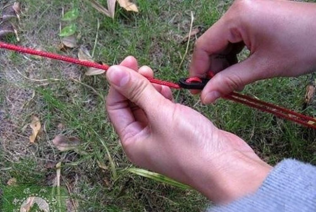 然后,前手将帐绳前端拉紧,后手捏住三孔滑片将它向帐篷端推近。用力抽紧,抽得越紧越好。