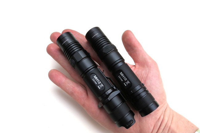 The tactical MH12 on the right has a clicky on its tailcap. It is for on/off operations and momentary illumination. The MH10 has a flat tail cap that enables it to stand steadily on its tail, thus frees your hands.