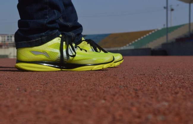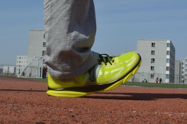 这是我快速跑步启动脚步时的瞬间,可以看到鞋面的剧烈形变,但是那碳纤织物绑带处形变却很小,韧性十足,牢牢的锁住了脚。包裹性和支撑性效果很明显。。。同时,鞋子的抓地力在这种橡胶颗粒操场上表现不错,大底切割也保证了足够的灵活性。