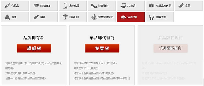 此外,天猫强调,在入驻流程中任何一环节商家提交的资质都必须真实有效。一旦发现资质造假,则一律请退。天猫方面还表示,目前除了公示的品牌以及不限制品牌商数量的类目外,其余品牌暂不招商。对于运动户外类别,天猫没有开放专营店(多品牌代理商)的申请,旗舰店(品牌拥有者)和专卖店(单品牌代理商)不受影响。