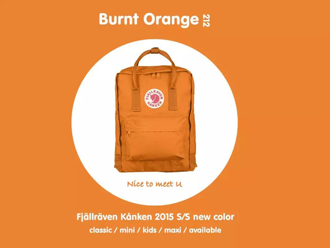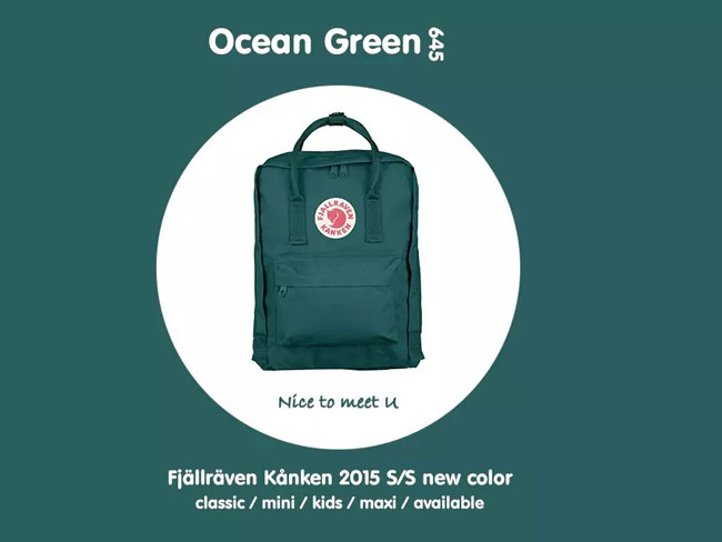 每到春夏,Fjallraven的Kanken系列都会推出新的配色,而在2015年春夏也不例外,今年春夏一口气有4位新朋友来报到:212 Burnt Orange 鲜橙 /539 Lake Blue 湖蓝 / 645 Ocean Green 海洋绿 / 615 Leaf Green 叶绿。