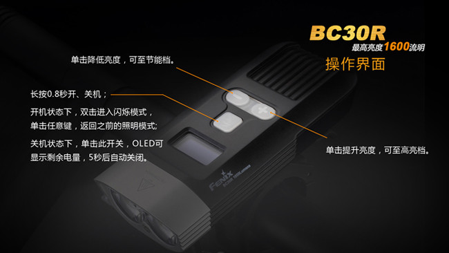 BC30R之所以受到ISPO大奖的青睐,其人性化的数显功能和操作界面功不可没:通过OLED屏幕,骑手可以直观地了解车灯的当前档位、剩余电量和续航时间,从而合理地规划骑行活动;带有背光功能的操作界面,支持双向的亮度调节,让档位切换更简捷。