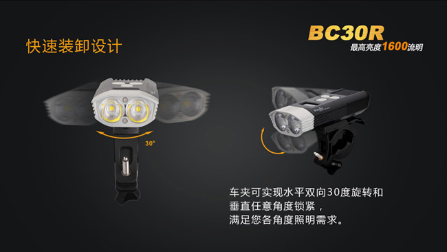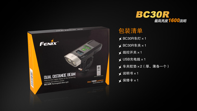 此外,凭借Fenix一贯的"远近双光斑"设计,BC30R的中白光源拥有了适于骑行的大照明范围。而通用的USB充电接口和全金属防水机身,则使得BC30R能够适应长距离、全天候的骑行运动。