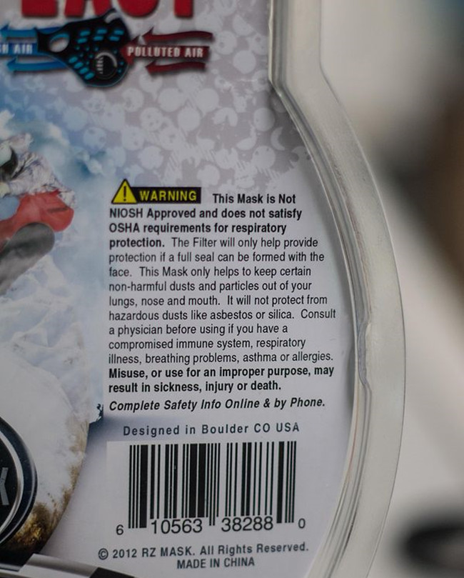 目前防护的标准有NIOSH,所以推荐买N95级别的口罩。但是,此奇葩物背后直接写着并非被NIOSH核准(This Mask is Not NIOSH Approved),而且也不能满足OSHA的呼吸防护标准(does not satify OSHA requirements for respiratory protection)。