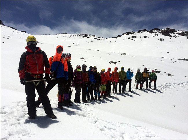 训练营的第三天,学员们将学习一些雪坡的行走步伐和滑坠制动。这个季节的四姑娘山,白天的温度已经是非常高了,为了让学员能切身感受雪地,我们将大部队转移到了巴郎山垭口,分组进行攀登技巧的学习。