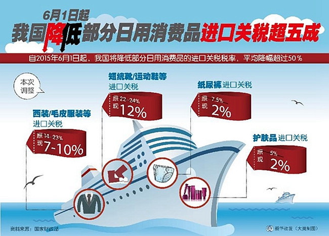 据财政部公告,自2015年6月1日起,我国部分服装、鞋靴、护肤品、纸尿裤等日用消费品的进口关税税率将下调,平均降幅超过50%。关税降低,到底对市场造成多大影响呢?