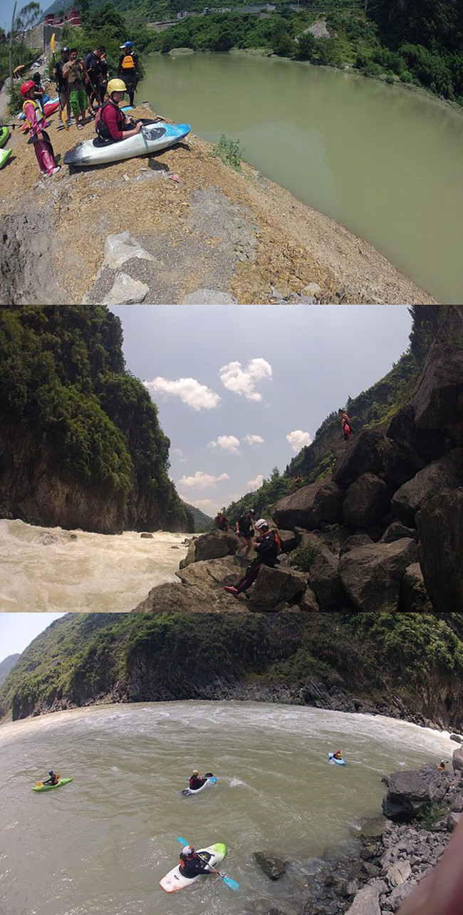 途中粉嫩粉嫩的是国内知名漂流团体《荡起浆》出品的短吻鳄,速度很快,性能也不错,但是因为稳定性不高,不适合新手,上图得意了没几分钟,我就在逆流而上的时候,因为调头和一个小浪的推动下,瞬间翻覆,算是我的第一次翻船,因为救生衣的靠谱,没有任何危险。