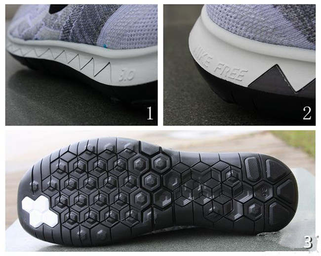 图1、2:评测的这双Free 3.0 Flyknit是白色款,外观上看相比前代最大的变化就是鞋面。鞋面整体向上延伸,鞋头的上翘幅度也变得平缓。Flyknit的编织方式也更加复杂,而不是2014版那种近乎对称的花纹,颇有当年Free Flyknit+的等高线纹路的味道。外侧logo向后平移,内侧logo略向下移动。