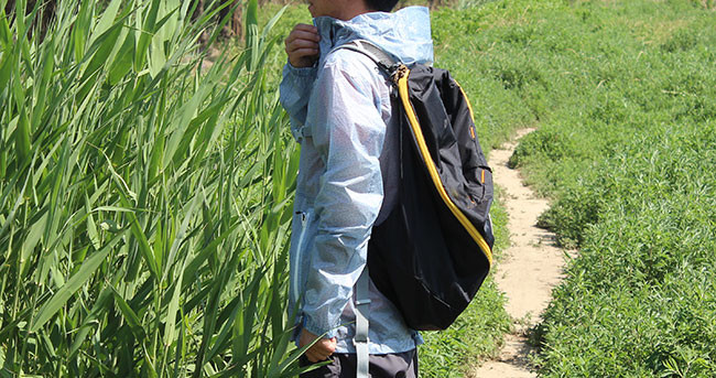 早晨刚出来时,还有习习凉风;穿着这件衣服感觉很舒服,配上我每一步走动时衣服上传来的哗哗的摩擦声,很有节奏很悠然自得;外界的凉风吹动皮肤衣接触到皮肤,能感觉传导过来的丝丝凉意,甚是惬意。一段时间的徒步后,身体稍感热起来,衣服的透气很好,热量很快就散失掉。