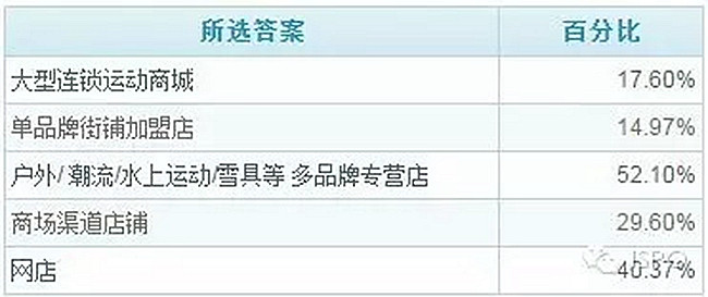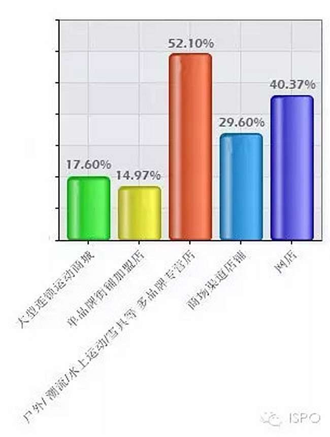 已注册的专业观众渠道形式分析中,拥有商场渠道店铺的经销商占3成,大型连锁运动商城也将近2成,而多品牌专营店更是比比皆是。