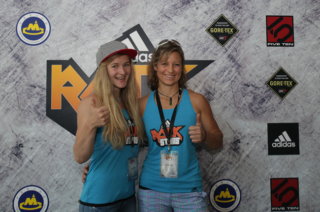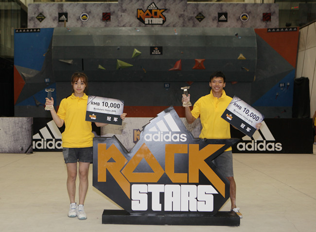 随着现场摇滚乐队RollingBowling的助兴,激烈又充满激情的旋律将攀岩与摇滚相互交融,将整场比赛推向了最高潮。在两两对决的直接厮杀和现场观众的热烈欢呼声中,adidasRockstars中国区的参赛代表正式产生,他们是男子组冠军游嘉俊和女子组冠军蒋融。在赢得桂冠的同时,他们还将获得2015年前往德国斯图加特参与Rockstars全球总决赛的比赛名额,并由adidas承担所有费用,以及10000元人民币的奖励。此外,GORE-TEX明日之星组和专业组的男女子前6名均获得了adidas提供的价值人民币1000-10000元不等的现金或户外装备的赛事奖励。比赛之余,adidas签约运动员,来自英国的ShaunaCoxsey和来自新西兰的MayanSmith-Gobat更是来到现场为中国区参赛选手们加油鼓劲,并与现场观众及参加少年攀石交流活动的小朋友们签名互动。