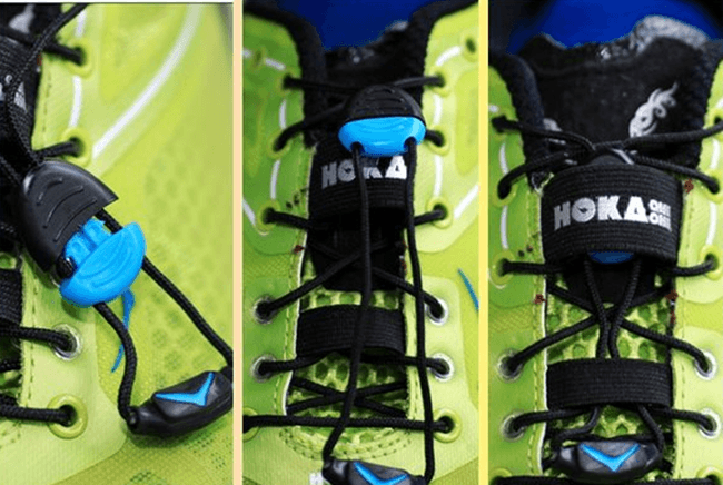 快速鞋带:Hoka 的快速鞋带,让人联想salomon的快速鞋带,自称RLS Race-Lace System,松开蓝色卡扣,可以收紧或者放松鞋带,有两道松紧带可以将鞋带和卡扣收紧在鞋面上,非常快速方便。