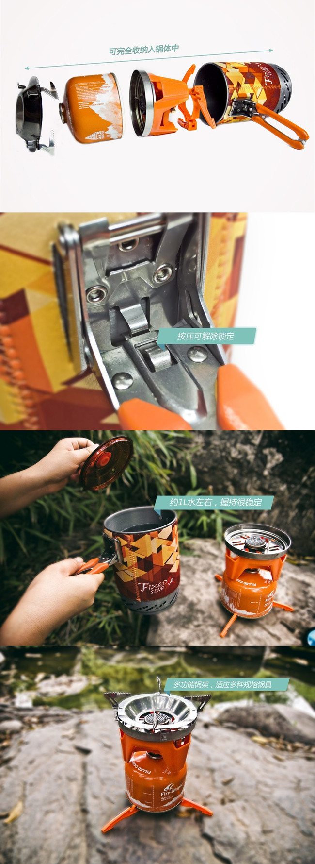 首先向外拨开手柄锁定扣,翻起手柄和锅体垂直,手柄会自动咔的一声和锅体锁定,在装满1L水的情况下手持很舒服很稳定。出厂标准配置是不含气罐的需自行购买,集热锅体里包含锅架、炉体、气罐支架,收纳时可把炉头和G2气罐容纳于锅体里。配备的多用锅架,拓展使用范围可搭配各种规格的锅具,这也体现了户外装备一专多能的特点。另配有气罐支架使用G2、G3、G5气罐,增加整体稳定性。