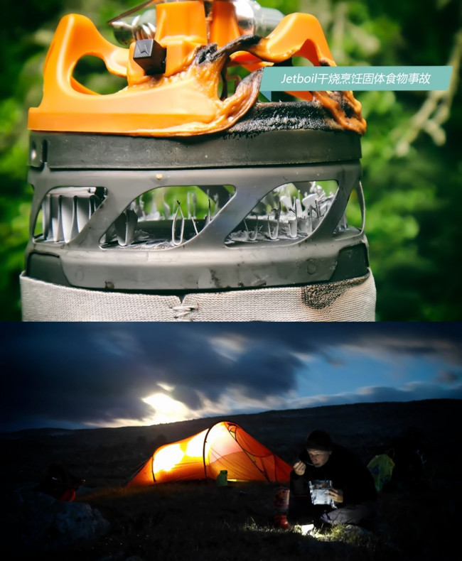 切记不可干烧或者煮固体食物,否者热量传递不了,会导致锅体和炉体受热过大导致损坏。下图是 Jetboil的事故例子: