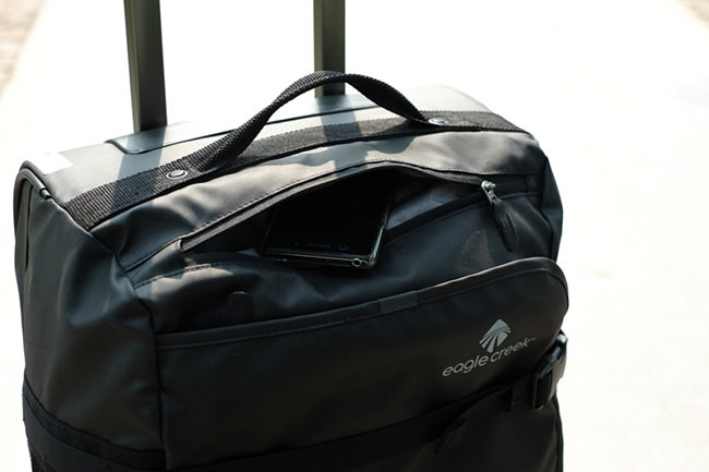 侧面的手提袋可以将Eagle Creek FlatbedTM Duffel横置提取。