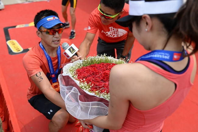 比赛结束之后,现场更是上演了感人一幕--参赛选手、中国著名铁三爱好者胡春煦与其女友携手冲线,并现场求婚成功。现场几百名铁人见证了这份爱情,纷纷用镜头记录下这份甜蜜温馨的时刻,向这对运动新人送上最诚挚的祝福!
