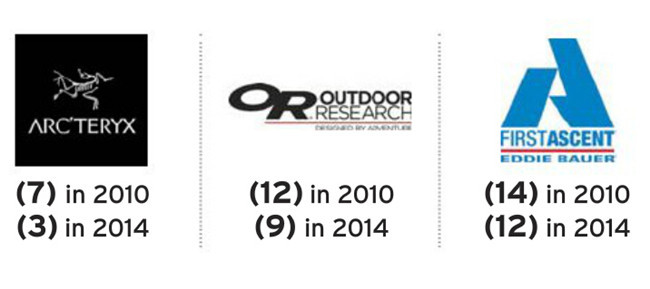 过去10年来,Patagonia、The North Face、Columbia、Mountain Hardwear一直是被美国消费者最为认可的几大技术型品牌。但近几年哪几个品牌又蹿红最快呢,是它们: