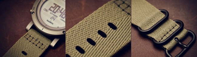 织物表带,宽24.5mm,柔软舒适,做工精细,每一个扣眼都经过单独加工防止脱毛,而和表轴连接处采用了双排的缝制方式,更是牢靠。