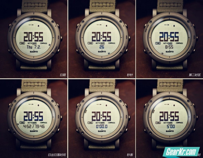 除了高度、气压、潜水三种主要模式外,每种模式下,下方的小显示区域还可以通过VIEW按钮调整出时间、温度、秒表等功能。
