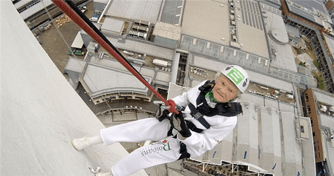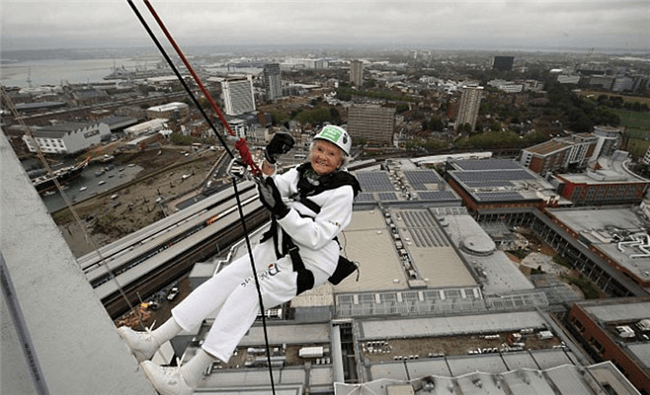 没错,年轻人该对自己负起责任了。英国101岁女子桃瑞丝·朗(DorisLong)日前打破自己创下的世界纪录,从英国171米高建筑上沿着绳索垂直下降,成为世界上年龄最大的挑战者。
