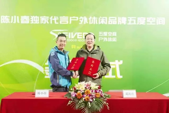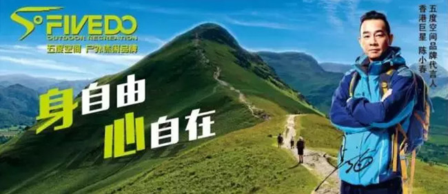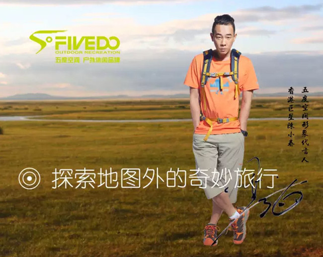 2015年7月17日,新生品牌FIVEDO“五度空间” 牵手国际影、视、歌巨星陈小春,盛邀其为FIVEDO品牌全新代言,并在深圳召开品牌代言新闻发布会。会上陈小春表示,户外运动服饰需要的是舒适度与潮流并存,“身自由,心自在!”。FIVEDO“五度空间”完美诠释了户外运动服饰追赶时尚潮流的真谛。