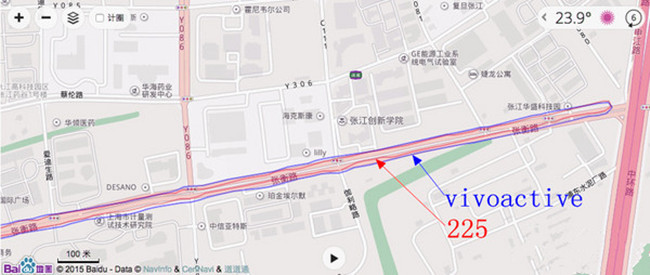 225的搜星速度基本稳定在半分钟到一分钟,和其他型号的表现差不多。这次没有像620的评测时在操场上进行跑圈测量,而是选取了周末一段公路长距离折返进行测试。对比选手是vivoactive,由于跑的是自行车道,从实际测量路线来看225比vivoactive更符合实际情况,路线基本在橙色道路区间上,但是两者差距也并不大,可以认为处于同一个精确度。