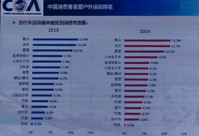 2014中国整体户外市场规模在不断扩大,体育用品业在2014年持续增长,国务院“46号”文件明确了体育产业发展方向,随着体育产业再次扩大发展,中国户外市场必然会迎来新的发展机遇。