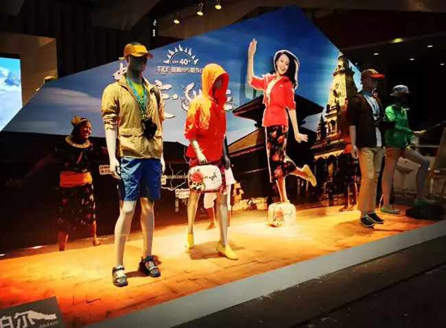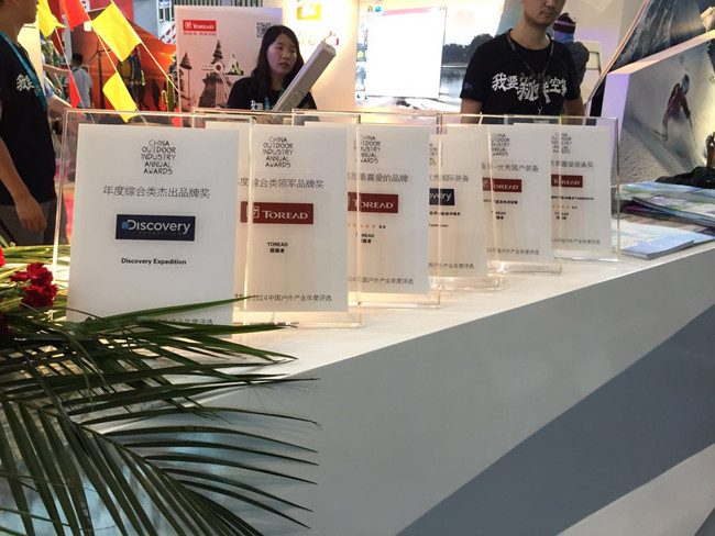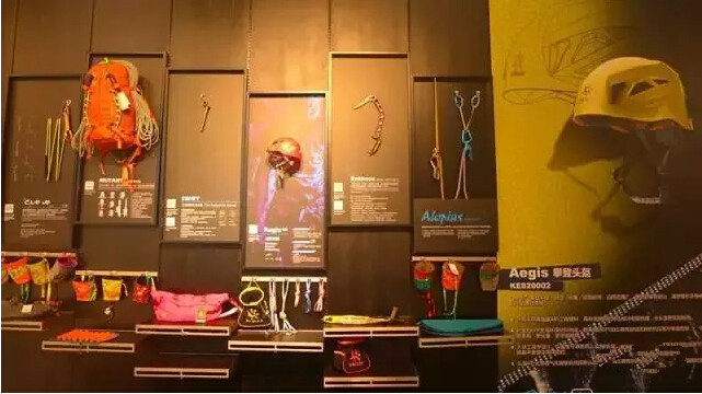 的展会现场,凯乐石展位的装潢陈列高端大气,整个陈列区分为攀岩服装、极限服装、攀登器械、装备、背包、跑步几个区域,分别展示了FlexShell防风抓绒外套、Mountain600高山羽绒睡袋、Aegis攀登头盔、Entheos技术冰镐等最新,最高品质,最高科技含量的专业户外用品和器械装备。其中“9a攀岩短裤”和“Mutant 45L/35L技术攀登背包”分别荣获了本届亚洲户外展的亚洲户外产业大奖。