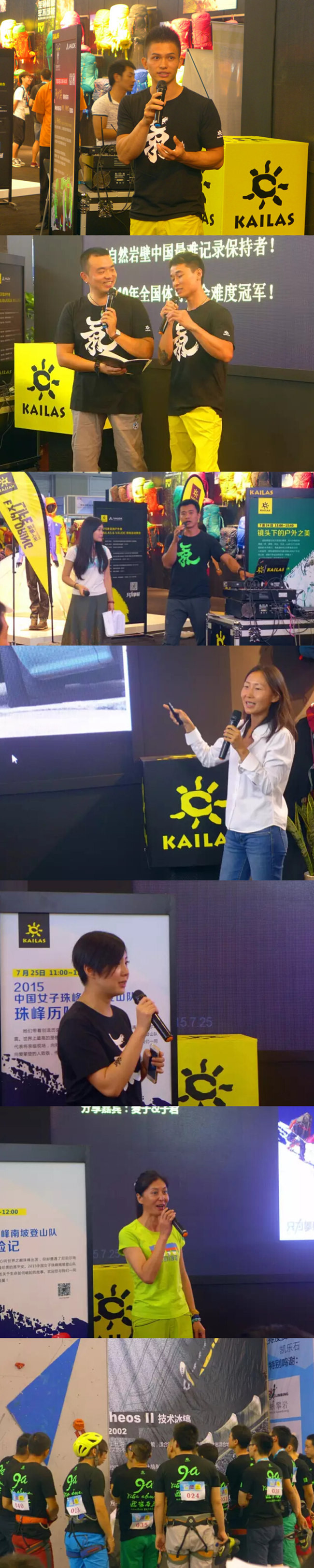 在让人目不暇接的展会上,凯乐石除了为业界带去新的视觉冲击,还秉承着分享交流的精神,以品牌文化为基调,以专业攀登、精益求精的精神,承载并传扬凯乐石十几年致力于推动中国攀登事业的发展历程。展会期间,7大主题活动:《世界冠军钟齐鑫见面会》《COACHK签约仪式》《镜头之下的户外之美》《2015中国女子珠峰南坡登山队珠峰历险记》《“香港100”的故事》《岩壁上的仰望》《冰雪战歌你往哪里跑》相继举行。除此之外,7月25-26日,凯乐石亚洲户外展干攀挑战赛同步推出。
