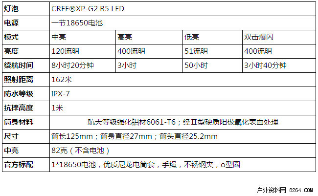 E5标配2200mh 可充电18650电池,最高亮度可达400流明,满足远距离搜索需求;同时有中亮、低亮、高亮三种常亮模式和双击爆闪模式,根据不同需求选择模式大大增强手电的续航能力。