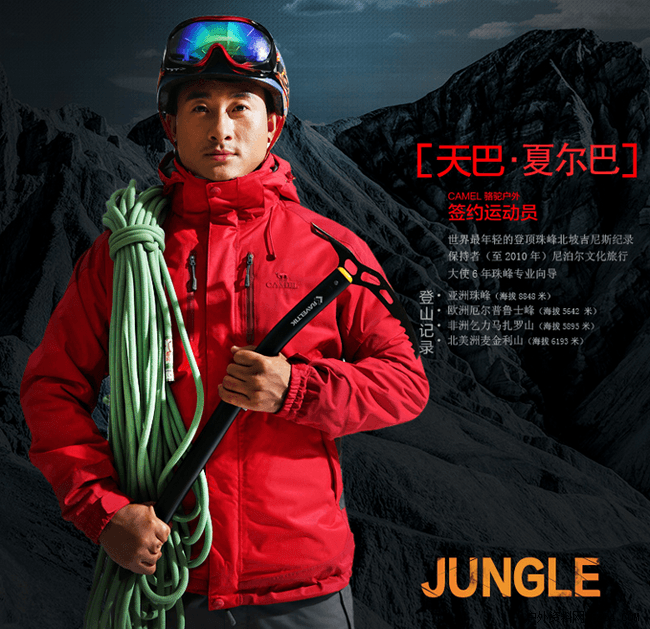至于为什么没有选择专业的户外运动员来作代言人,万总表示,骆驼也有签约很多优秀的户外运动员,其中不乏曾创造世界最年轻的的登顶珠峰北坡的吉尼斯记录者天巴·夏尔巴,但考虑到户外运动员能影响的群体还比较小众。目前,国内户外运动尚处于起步发展阶段,选择像范冰冰这样的大牌明星,将可以影响更多的人去了解户外,接触户外。