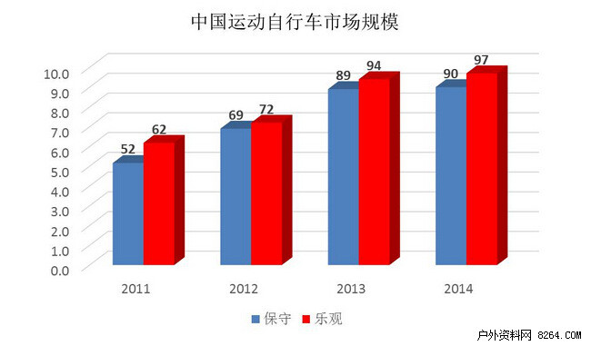 由上图看出,从2011至2014年,中国运动自行车市场规模逐年增长,前两年增长速度较快,而从2013年到2014年,无论是保守估算还是乐观统计,其增长速度都有所放缓,2014年,中国运动自行车市场规模约为90~97亿元人民币(相当于15-16亿美金,或12~13亿欧元),增长率为1.1-3.2%。